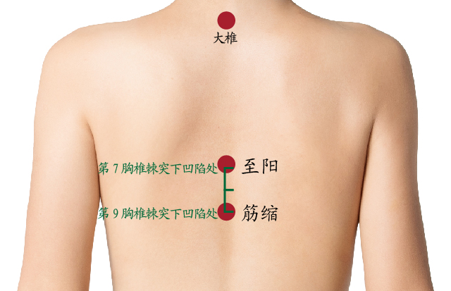 第1步:俯卧位或正坐位; 第2步:在上臂自然下垂时贴于胸侧壁时确定肩胛下角; 第3步:从两侧肩胛下角连线与后正中线相交处所在椎体为第7胸椎; 第4步:在该椎体棘突下凹陷处,即为本穴。